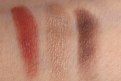 Swatches: Warm red with just a hint of sparkle is the outermost shade, champagne gold with an almost metallic quality is the dominant, central shade, and burgundy brown matte is the center shade.
